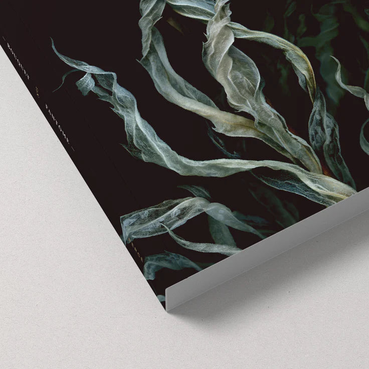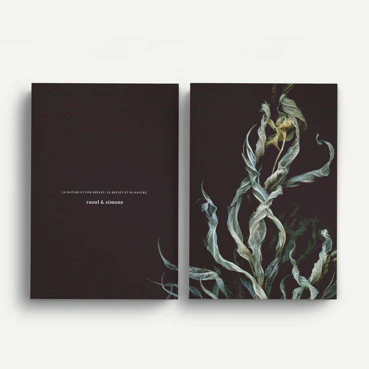Magnifique carnet écoresponsable avec couverture au fini velour. La Fantôme est une oeuvre de la série « Un Bouquet pour Simone » composée uniquement de feuilles de verges d'or cueillies en forêt boréale et dépigmentées en atelier.