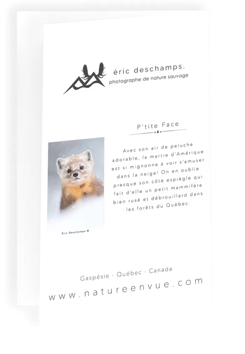 Les cartes de souhaits Nature en vue par Éric Deschamps sont idéales pour toutes les occasions. Le recto présente une image unique de la faune sauvage québécoise ou d'un paysage photographié par Éric Deschamps et le verso, une brève description de l'image. Qu'il s'agisse d'un anniversaire, de félicitations, de remerciements, de voeux des Fêtes ou tout autre événement, les cartes de souhaits peuvent être offertes en tout temps grâce à leur intérieur vierge qui vous permet d'inscrire le message de votre choix.