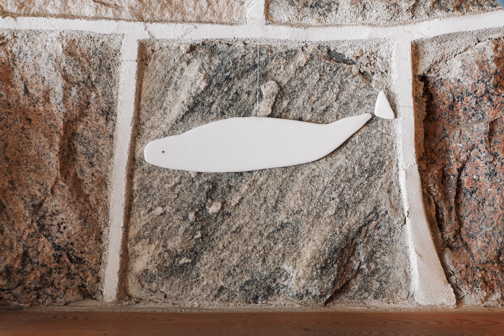 Un mobile béluga fait de verre à suspendre devant une fenêtre ou sur un joli crochet.